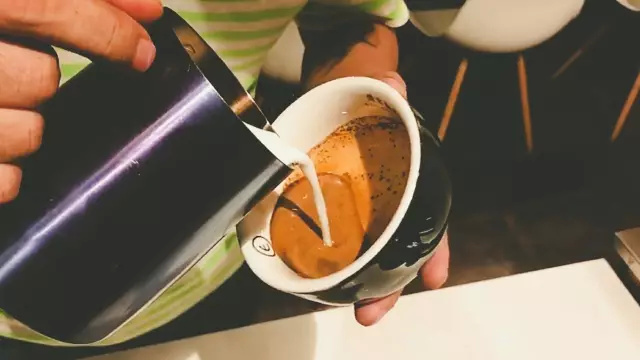 1.傾斜咖啡杯,對準濃縮咖啡液面中央