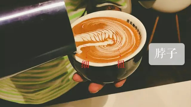 ? 右手緊握拉花缸,讓蒸汽牛奶由缸嘴垂直形成水流。