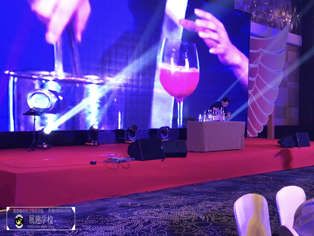 不多時(shí),全場佳肴已近杯盤狼藉,賓客們帶著點(diǎn)疲倦,會議氣氛一時(shí)走入低谷。瞬間,滾動性極強(qiáng)的音樂使得全場目光都投注到大屏幕上,佛山展翅咖啡調(diào)酒西點(diǎn)培訓(xùn)學(xué)校的花式調(diào)酒師張韋杰先生已經(jīng)登場。張韋杰先生前面的桌上擺放著七八瓶不同款式的酒,少許調(diào)酒工具,和一只雞尾酒酒杯。全場帶著好奇的目光盯著臺上:能調(diào)出什么顏色的酒?