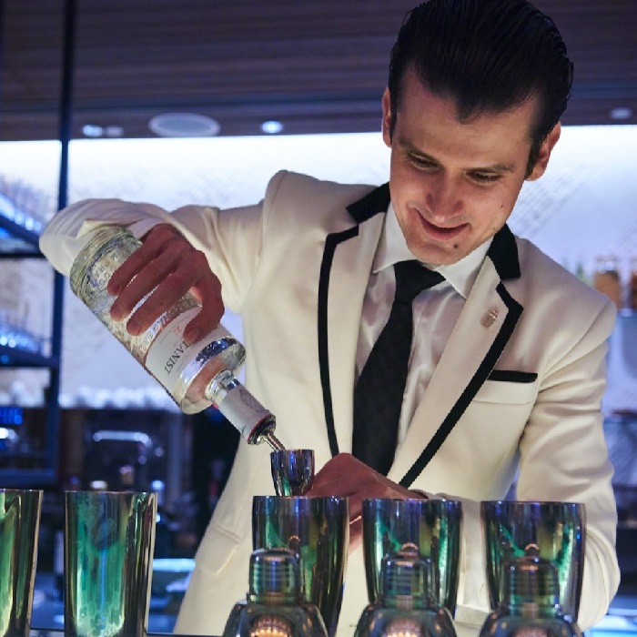 “隨時為客人服務,而不要等著客人來找你。你需要觀察四周,凡事先考慮一下客人的感受。比如吧臺后的水槽:調酒師一定要記得關水龍頭,即使只是離開一小會兒。這對你來說不算什么,但是對客人來說,這種聲音讓人忍不住想上廁所。你的客人可能還沒倒過時差來,所以你必須注意自己發出的聲響,避免影響到他們。還有,要是你在吧臺后說自己的語言,客人聽不懂,可能會覺得你是在談論他們。所以你應該只講英語。這是我的秘訣。”