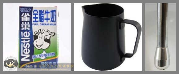 準備冷藏過的牛奶(4℃),奶缸,咖啡機