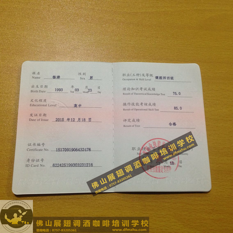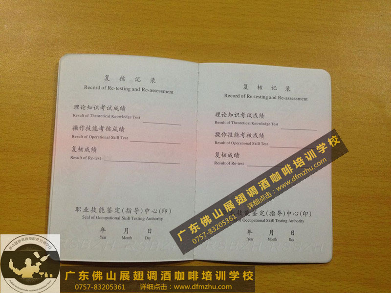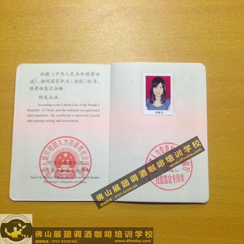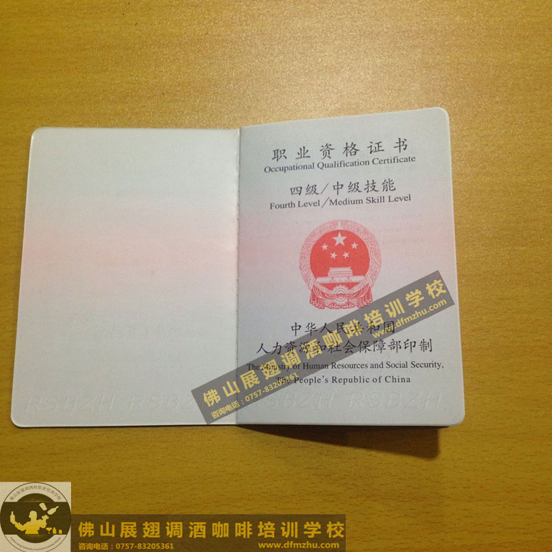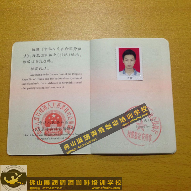 中英文版的職業資格證書出國通用。(調酒師、咖啡師、西點師職業資格證書)佛山展翅調酒咖啡西點培訓學校畢業學生,100%通過率,順利拿到中華人民共和國人力資源和社會保障部,頒發的調酒師、咖啡師、西點師職業資格證書部分樣版。