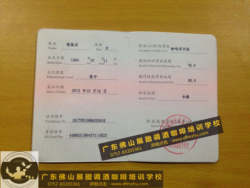 以下所有證書,都是佛山展翅調酒咖啡西點培訓學校畢業學生,考取的調酒師、咖啡師、西點師職業資格證書,為了防止盜圖,全部加了水印。